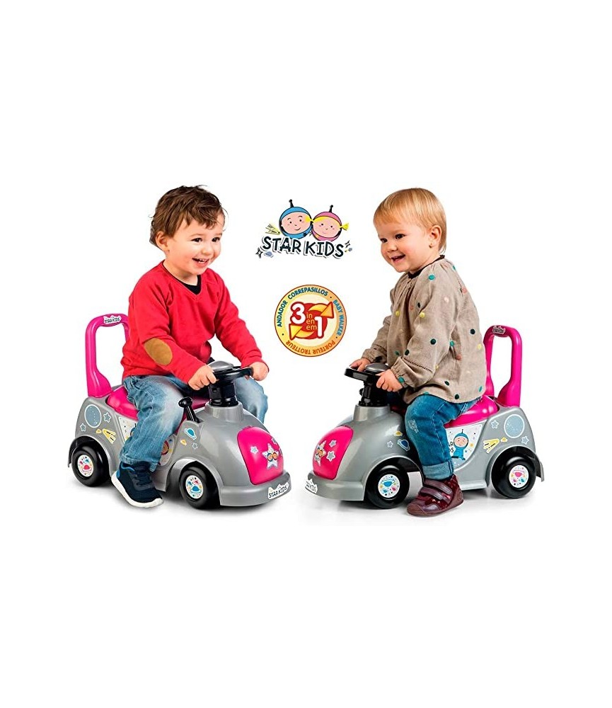 Andador com atividades rosa 3 em 1: compartimento para guardar objectos; andador para início de marcha; veículo carrinho para força motriz através dos pés da criança