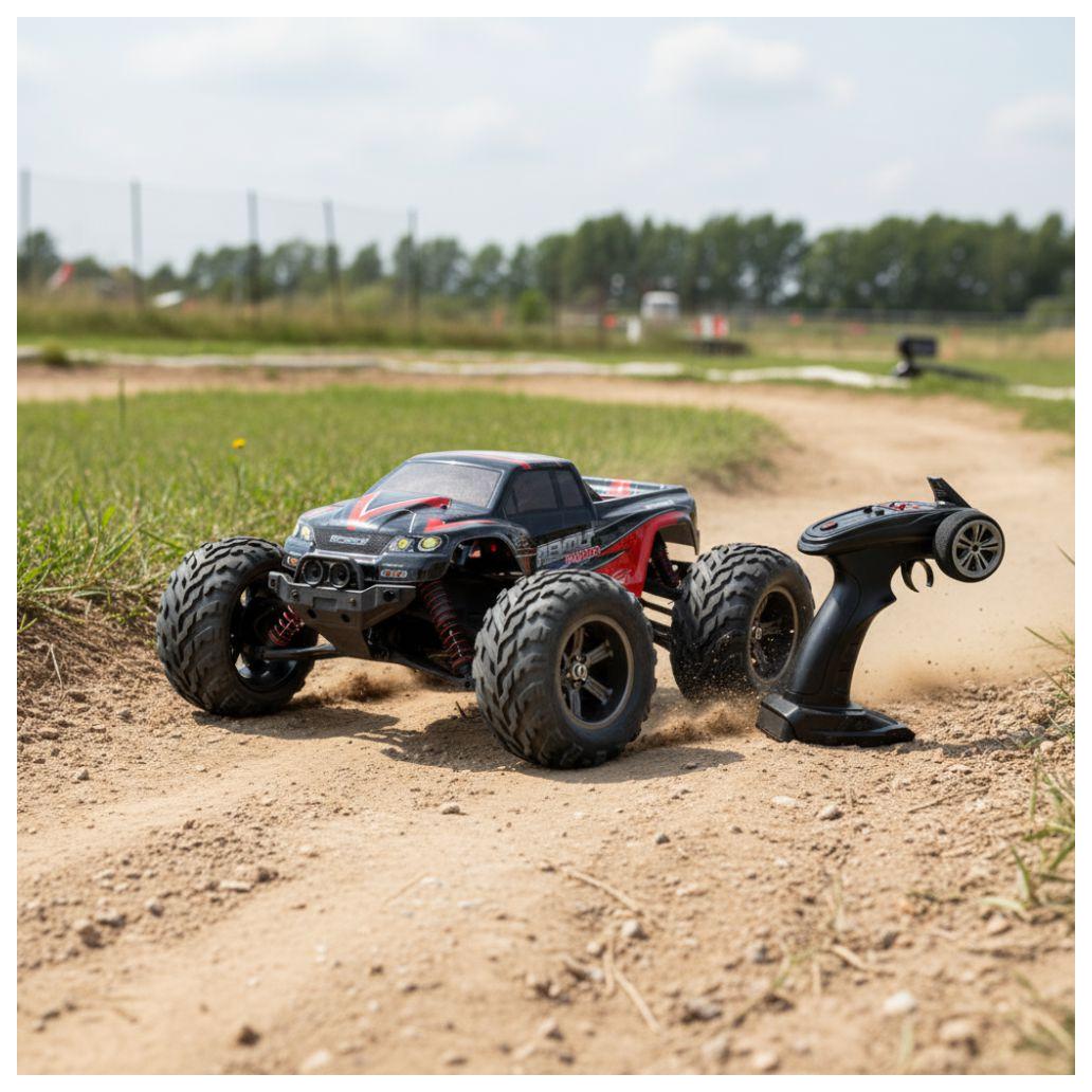 Com um controlo remoto com alcance até 60 metros, o Revolt permite-te explorar trilhos e pistas amplas com liberdade — e o mais difícil será manter o carro à vista, não o comando nas mãos.