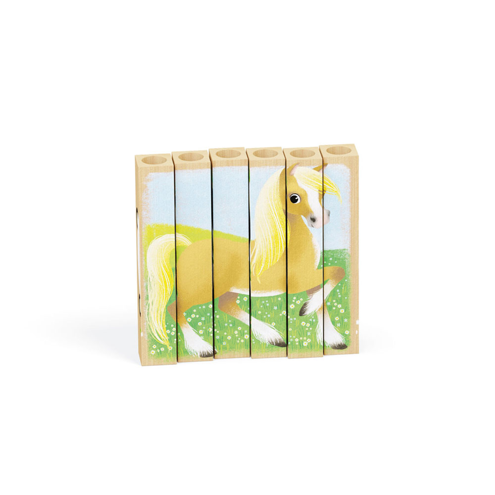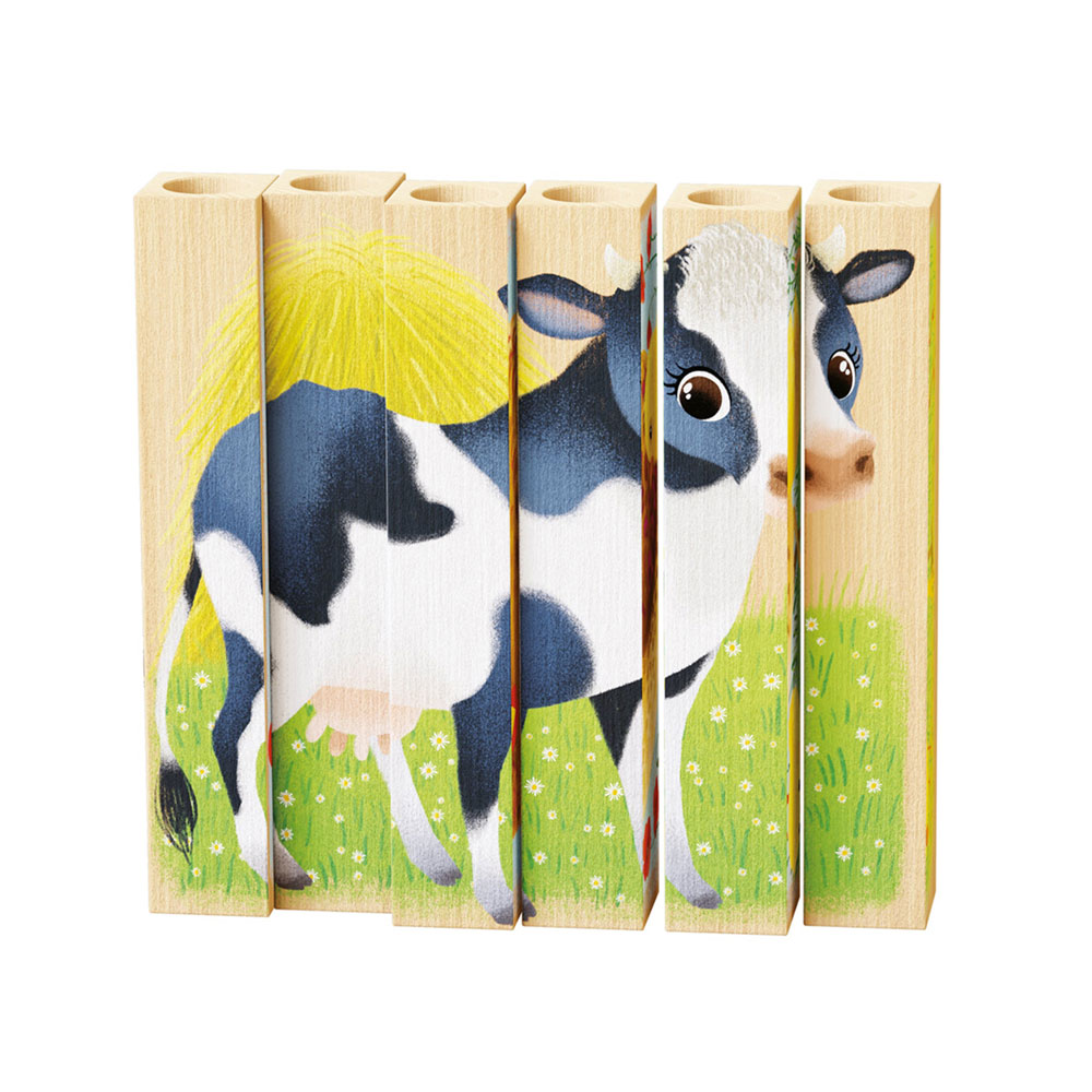 6 barras de madeira ligeira para compor 4 puzzles, horizontais ou verticais; um brinquedo aparentemente fácil, mas que reserva surpreendentes dificuldades, para estimular as crianças.